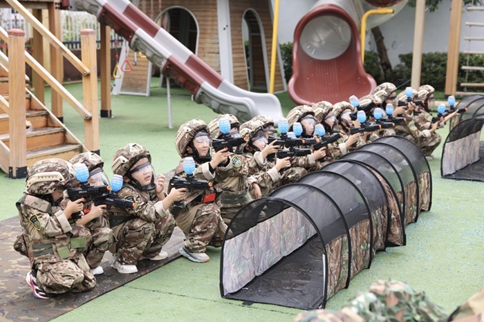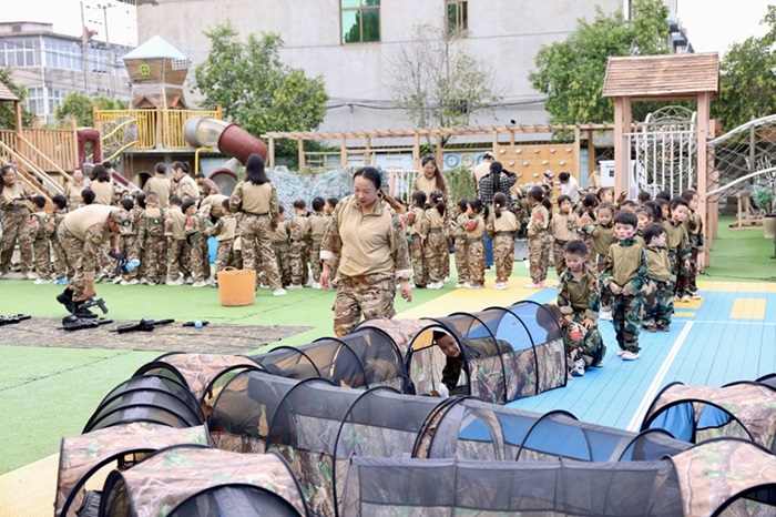 为使幼儿获得更加真实且有趣的体验,本次活动共设置开营仪式和出营训练项目两大部分。其中,开营仪式有“生在国旗下,长在春风里”巨型国旗入场、幼儿入场仪式、升国旗、国旗下宣誓、高唱红歌、园长致辞等环节,弘扬爱国主义精神;出营训练项目则设置重重关卡,将“长征元素”融入各环节,巧妙创设游戏的各种场景,如重走长征路、定点打靶、手雷投掷、斯巴达小勇士挑战赛、小军人真人CS等项目,将红色故事、革命精神融入到体育游戏中,幼儿在享受运动乐趣的同时,感受革命先辈不怕困难、敢于拼搏的奋斗精神。