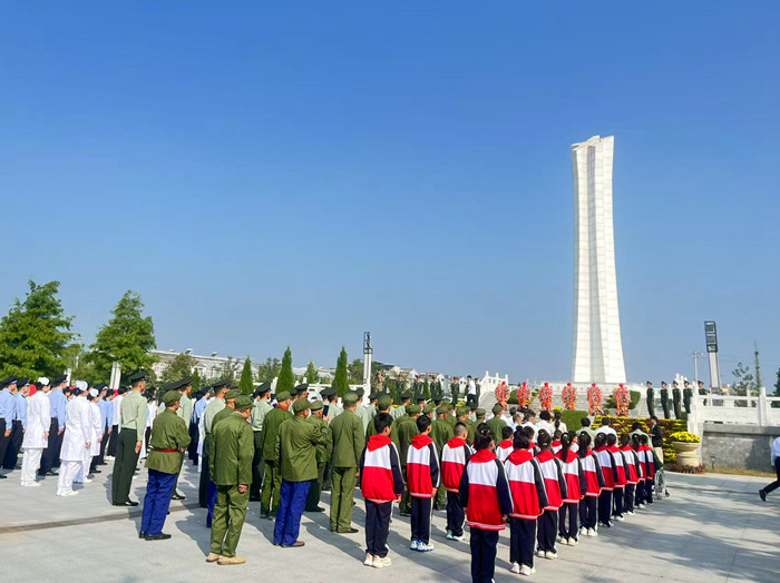 9月30日上午,淮海战役十人桥烈士陵园内庄严肃穆,新沂市政府精心策划的公祭活动在此举行。这片浸染革命热血的土地上,各界代表齐聚,新沂市草桥镇堰头小学师生队伍尤为醒目,他们怀着对先烈的崇敬,踏上追寻红色记忆的精神之旅。