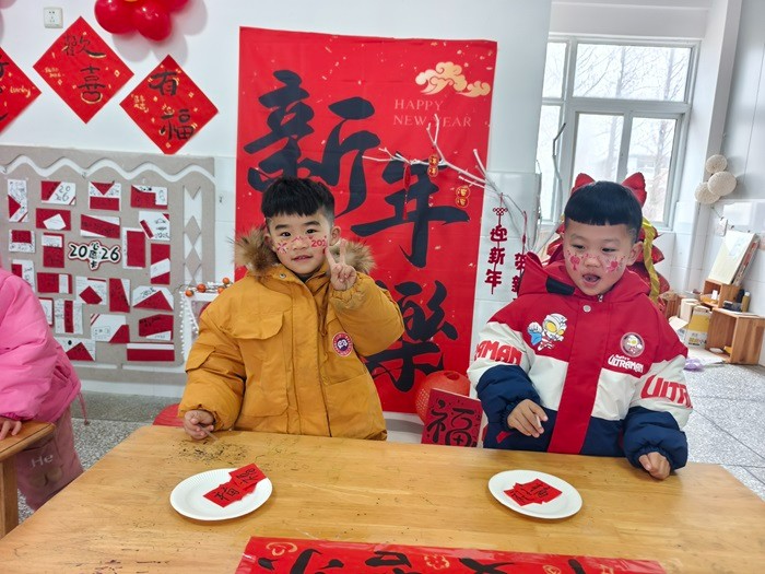 小班教室里暖意融融,专属萌娃的“集福之旅”趣味十足。老师们准备了趣味满满的吸福气、沾福气小游戏,孩子们奋力吸起福字,伸手粘贴福气卡片,小脸洋溢着兴奋与喜悦;福字拓印环节最受欢迎,孩子们手持工具,认真蘸取颜料,小心翼翼拓印出一个个红彤彤的福字,在动手体验中感受传统年俗的魅力,把满满的福气带回家。